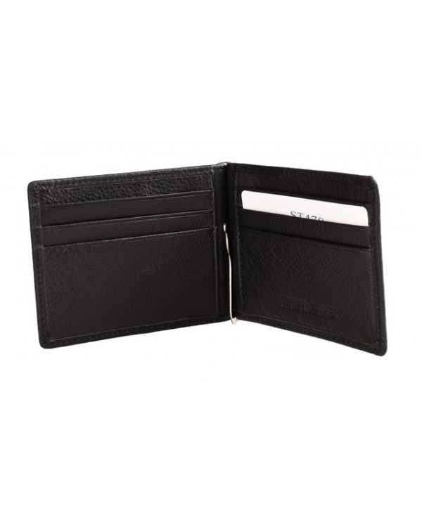 Чоловічий шкіряний затискач ST 470 Black. Усередині 6 кишень для карт, дві додаткові великі кишені, знімний затискач для купюр, на звороті монетниця на блискавці. Закривається на магніті. Розмір(см) 11,5*8,5*1. Поставляється у коробці.