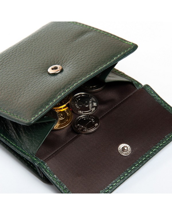 Всередині знаходяться 2 відкритих відділення для банкнот, розділені шкіряною перегородкою і одне відділення на блискавці, 5 кишень для візитних карток. Зовні гаманця на фасаді розташована кишеня-монетниця під клапаном на кнопці. Розмір (см.) 10,5*10*2,5. Поставляється у коробці.