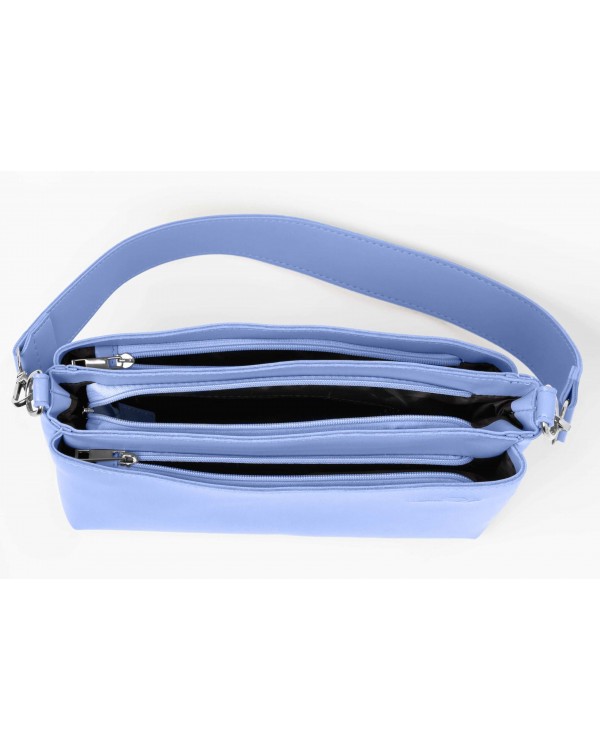 Жіноча сумка 754 блакитна. Три окремі відділення на блискавках. Всередині центрального відділення потайна кишеня на блискавці і відкрита кишеня. У комплекті довгий регульований ремінь. Розмір (см.) 19*29*10см.
