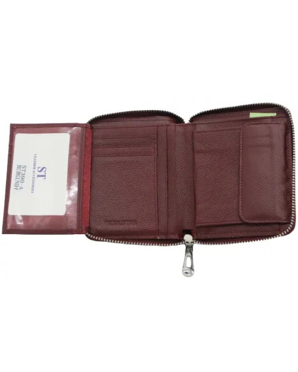 Жіночий шкіряний гаманець на блискавці ST 390-A бордовий. Одне відділення для банкнот, 7 кишень для візиток (одна з яких прозора), монетниця на кнопці. Розмір (см) 9,5*11. Поставляється у фірмовій коробці.