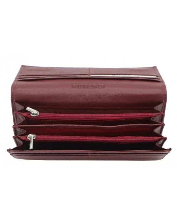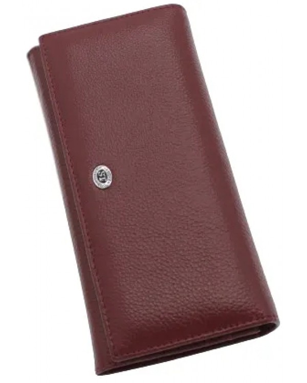 Жіночий шкіряний гаманець ST 014 бордовий на магнітах. Всередині знаходяться 4 відділення для банкнот, дві кишені-монетниці на блискавці, велика відкрита кишеня та 8 кишень для карток та візиток. Ззовні гаманця на звороті є кишеня на блискавці. Розмір(см) 18,5*9*3. Матеріал – натуральна шкіра. Поставляється у фірмовій коробці.