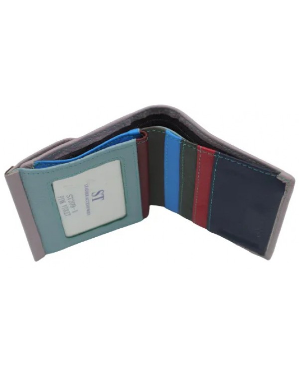 Жіночий шкіряний гаманець ST маленький. Закривається на магніт. Три відділення для банкнот (одне з них на блискавці), 4 кишені для візиток (одна прозора), на фасаді монетниця на кнопці. Розмір (см) 10,5*10. Поставляється у фірмовій коробці.