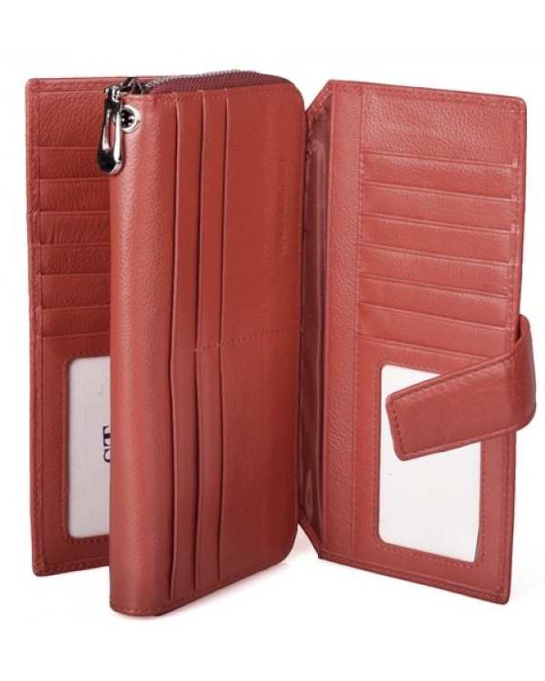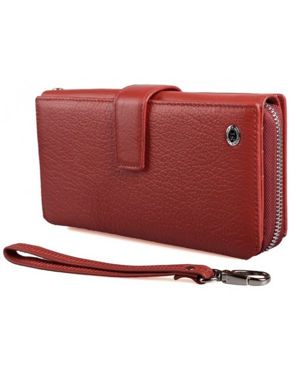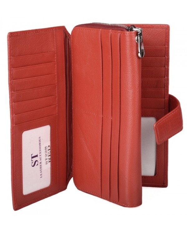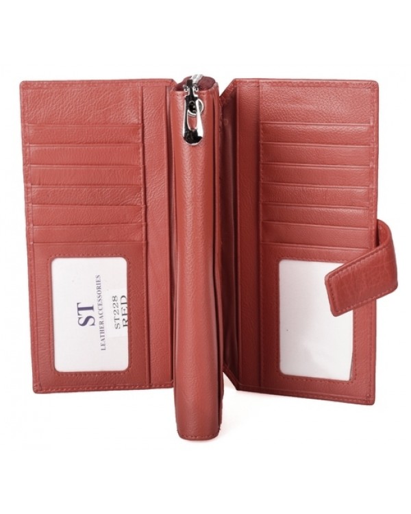 Жіночий шкіряний гаманець ST на блискавці з візитницею. Під блискавкою - два відділи для купюр та відділ на блискавці, з двох сторін гаманця є два відкидні клапани з додатковими кишенями для купюр (6 кишень) та 21 кишеня для карт. У комплекті – ручка на зап'ястя. Розмір см, 10,5*20,5*3,5. Поставляється у фірмовій коробці.