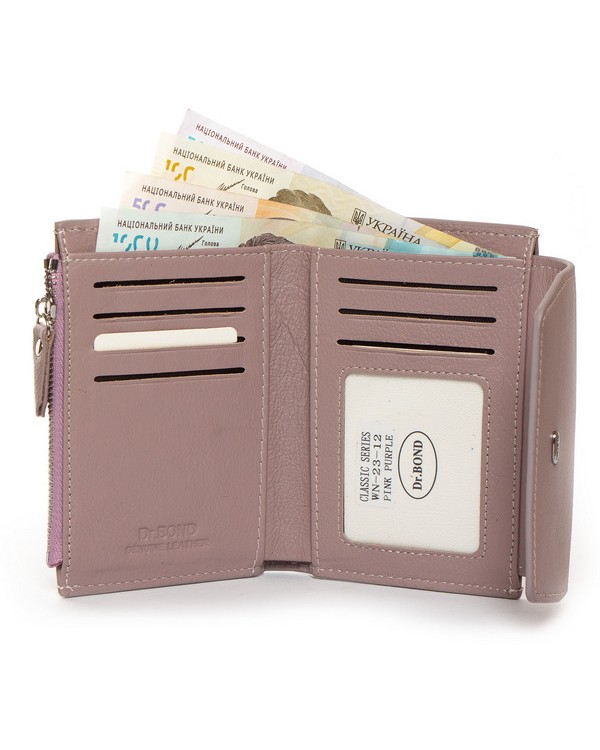 Шкіряний жіночий гаманець Dr.Bond WN-23-12. Складається вдвічі та закривається великим клапаном на прихованому магніті. Всередині одне відкрите відділення для банкнот, 7 кишень для візитних карток, 2 великі кишені та кишеня-монетниця на блискавці. Ззовні гаманець ще одна монетниця на блискавці. Розмір(см) 13,5*9,5*2,5. Поставляється у коробці.