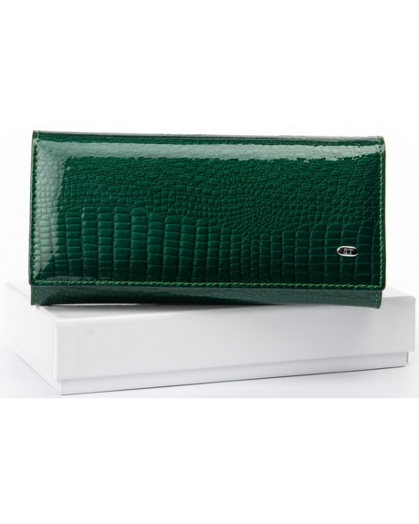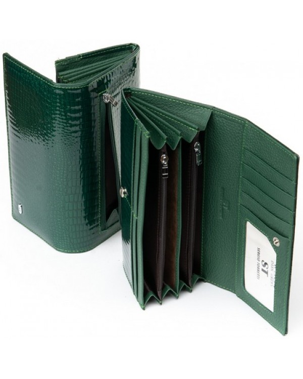 Жіночий шкіряний гаманець SERGIO TORRETTI W501 dark-green. Зовнішня частина – лакова шкіра, внутрішня частина – натуральна м'яка шкіра. Головне відділення закривається на кнопку. Усередині знаходяться 4 відкритих відділення для банкнот, дві кишені-монетниці на блискавці, одна велика відкрита кишеня, 9 кишень для візитних карток, одна з яких прозора. Ззовні гаманця на звороті є кишеня на блискавці. Розмір (см.) 18,5*9,5. Поставляється у коробці.