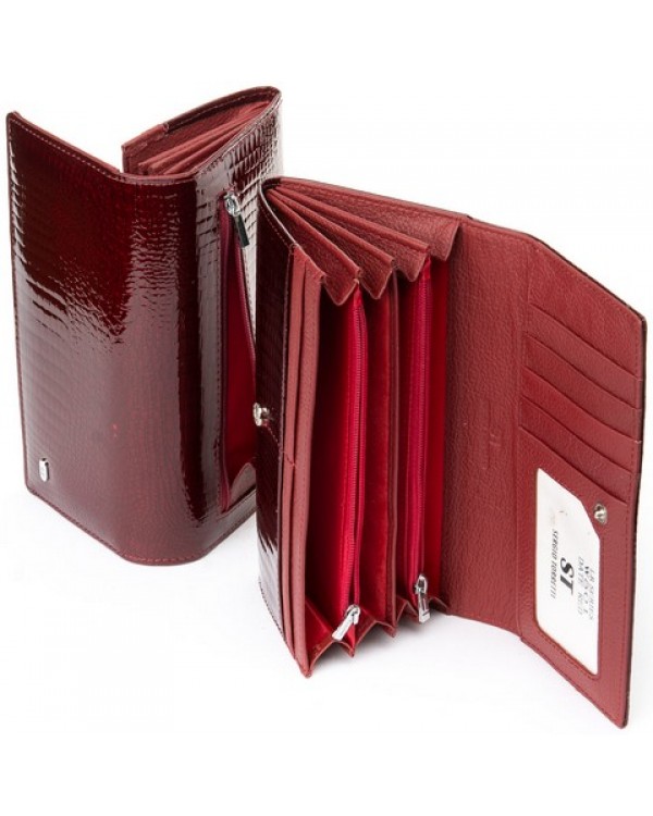 Жіночий шкіряний гаманець SERGIO TORRETTI. Зовнішня частина – лакова шкіра, внутрішня частина – натуральна м'яка шкіра. Головне відділення закривається на кнопку. Усередині знаходяться 4 відкритих відділення для банкнот, дві кишені-монетниці на блискавці, одна велика відкрита кишеня, 9 кишень для візитних карток, одна з яких прозора. Ззовні гаманця на звороті є кишеня на блискавці. Розмір (см.) 18,5*9,5. Поставляється у коробці.