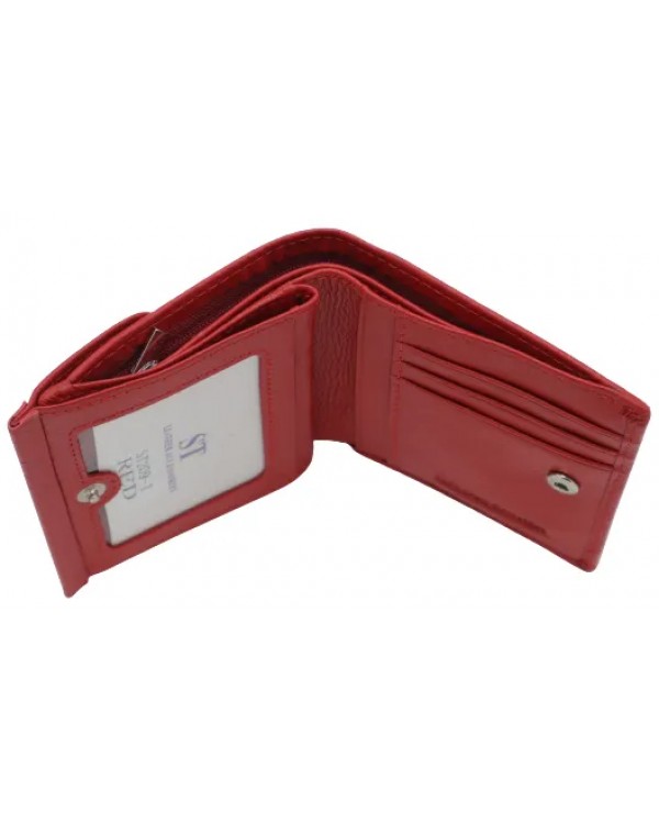 Жіночий шкіряний гаманець ST 209-A червоний. Закривається на кнопку. Три відділення для банкнот (одне з них на блискавці), 7 кишень для візиток (одна прозора), на фасаді монетниця на кнопці. Розмір 10,5*10см. Поставляється у фірмовій коробці.