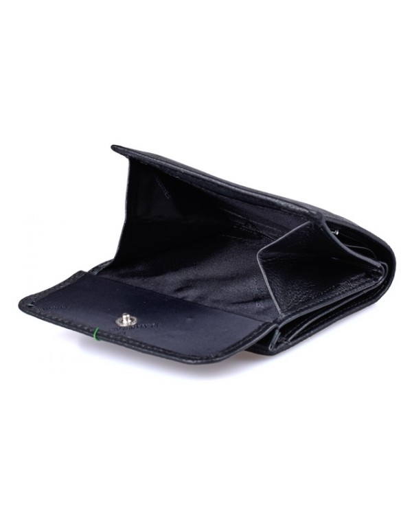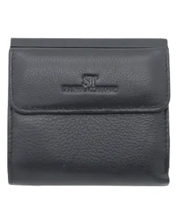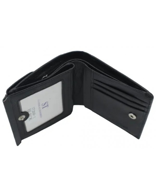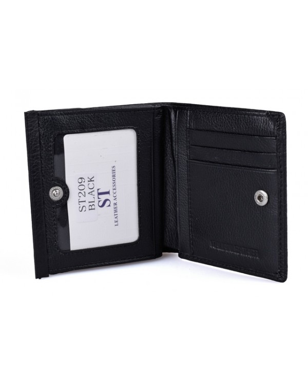 Жіночий шкіряний гаманець ST 209-A чорний. Закривається на кнопку. Три відділення для банкнот (одне з них на блискавці), 7 кишень для візиток (одна прозора), на фасаді монетниця на кнопці. Розмір 10,5*10см. Поставляється у фірмовій коробці.