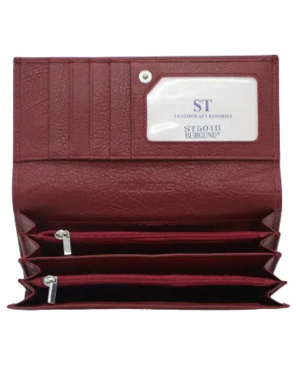 Жіночий шкіряний гаманець ST. Великий класичний гаманець ST. Всередині 4 відділи для банкнот, дві кишені на блискавках, велика відкрита кишеня і 9 кишень для карт і візиток (одна з них прозора). Ззовні на зворотній стороні кишеня на блискавиці. Розмір (см) 18,5*9*3,0. Постачається в коробці.